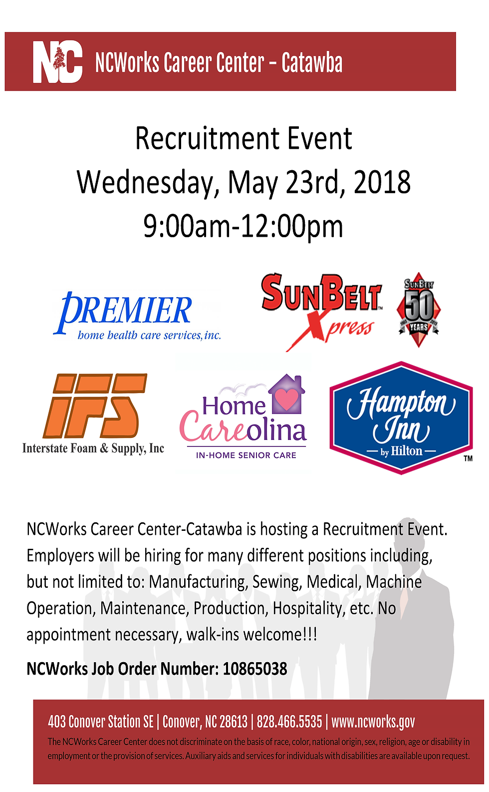 May 23rd, 2018 | Multi-Employer Recruitment Event at the NCWorks Career Center-Catawba from 9AM to 1May 21, 20180 min read