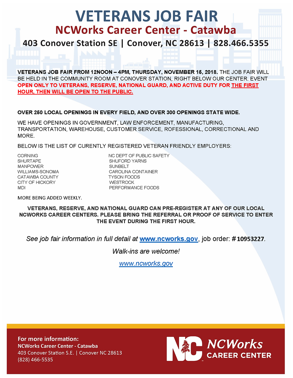 Veterans job fair from 12pm – 4pm, Thursday, November 15, 2018
